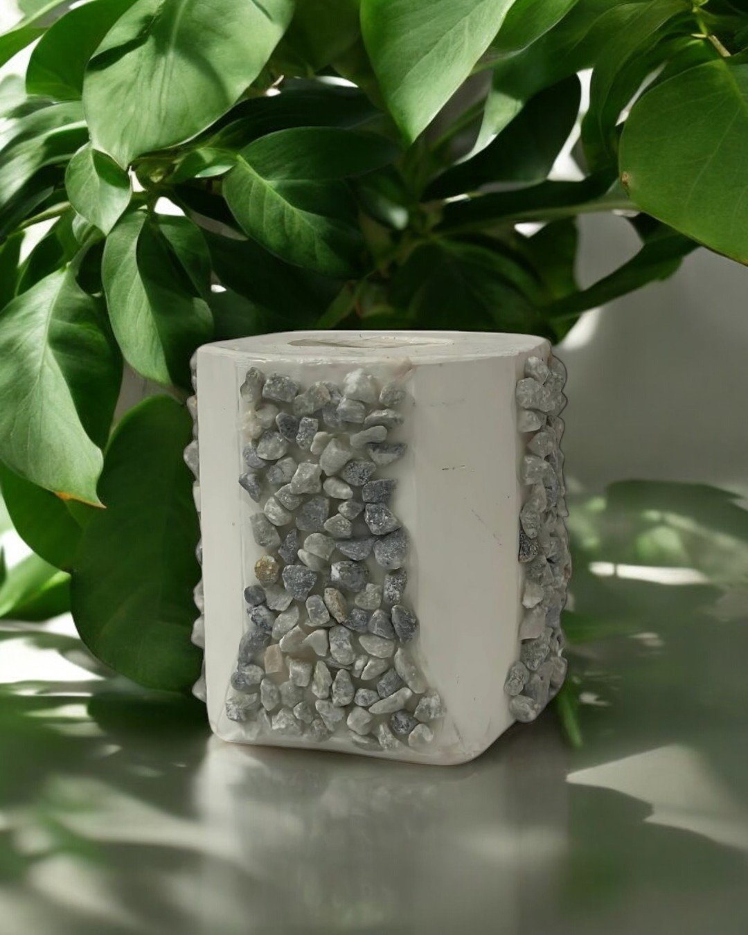 This pot serves as a beautiful decor and can enhance the beauty of your side table, block in the wall, chester or can be used as a planter.Size and shape can be customized along with the colour.Made up of black cement and plaster of Paris, embellished with white and grey concrete.