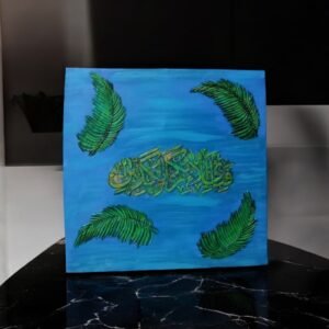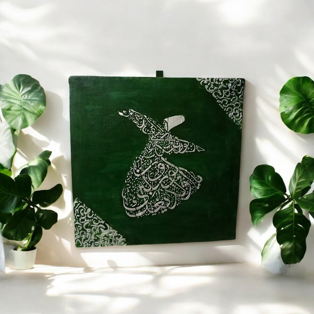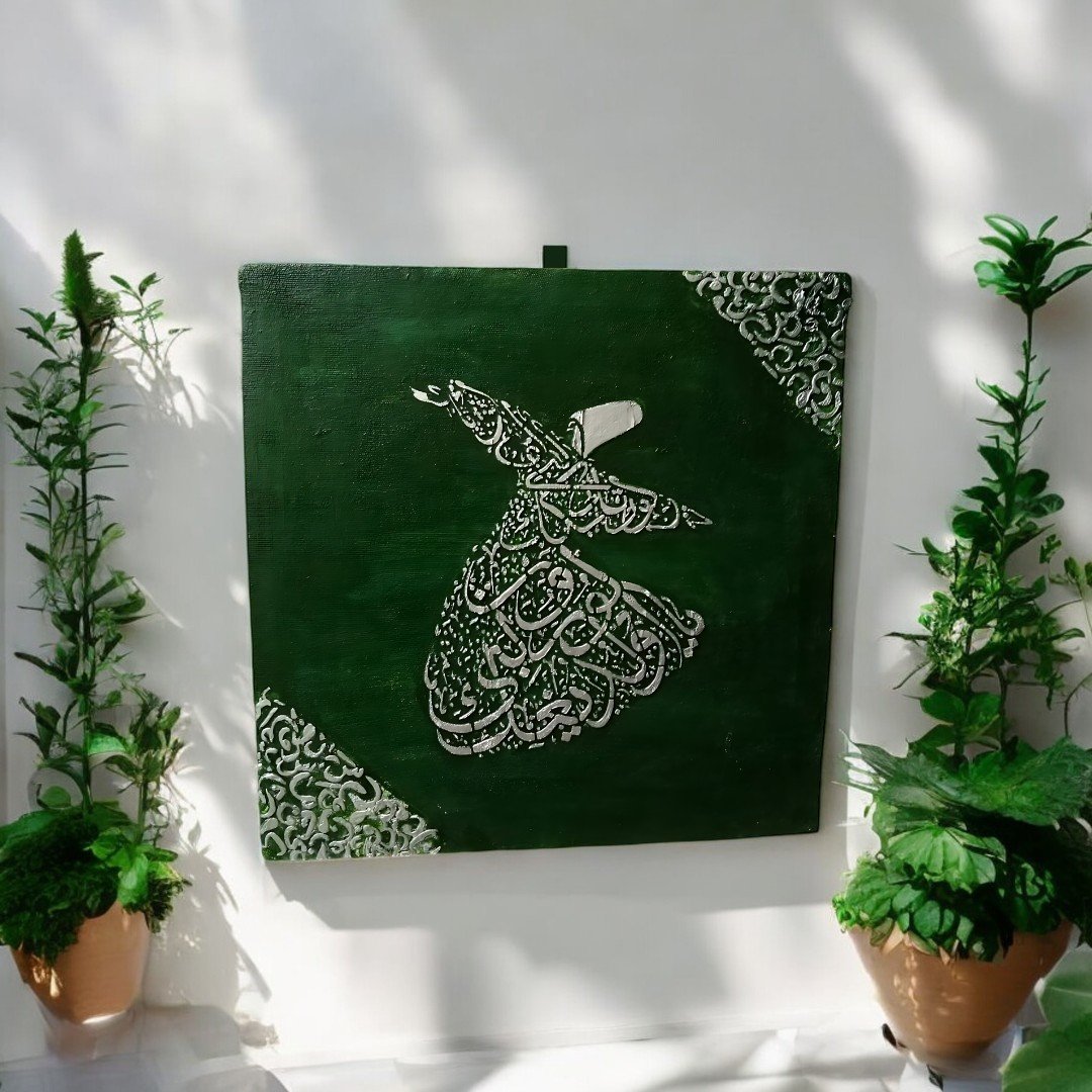 1 by 1 canvas with 3d dancing Darvaish that can add an entirely unique touch to the wall or any corner of your room.Embossed calligraphy Ayat from Quran in the middle and calligraphic words in the corner.Bottle green with silver acrylic colours are used along with plaster of Paris and white glue.