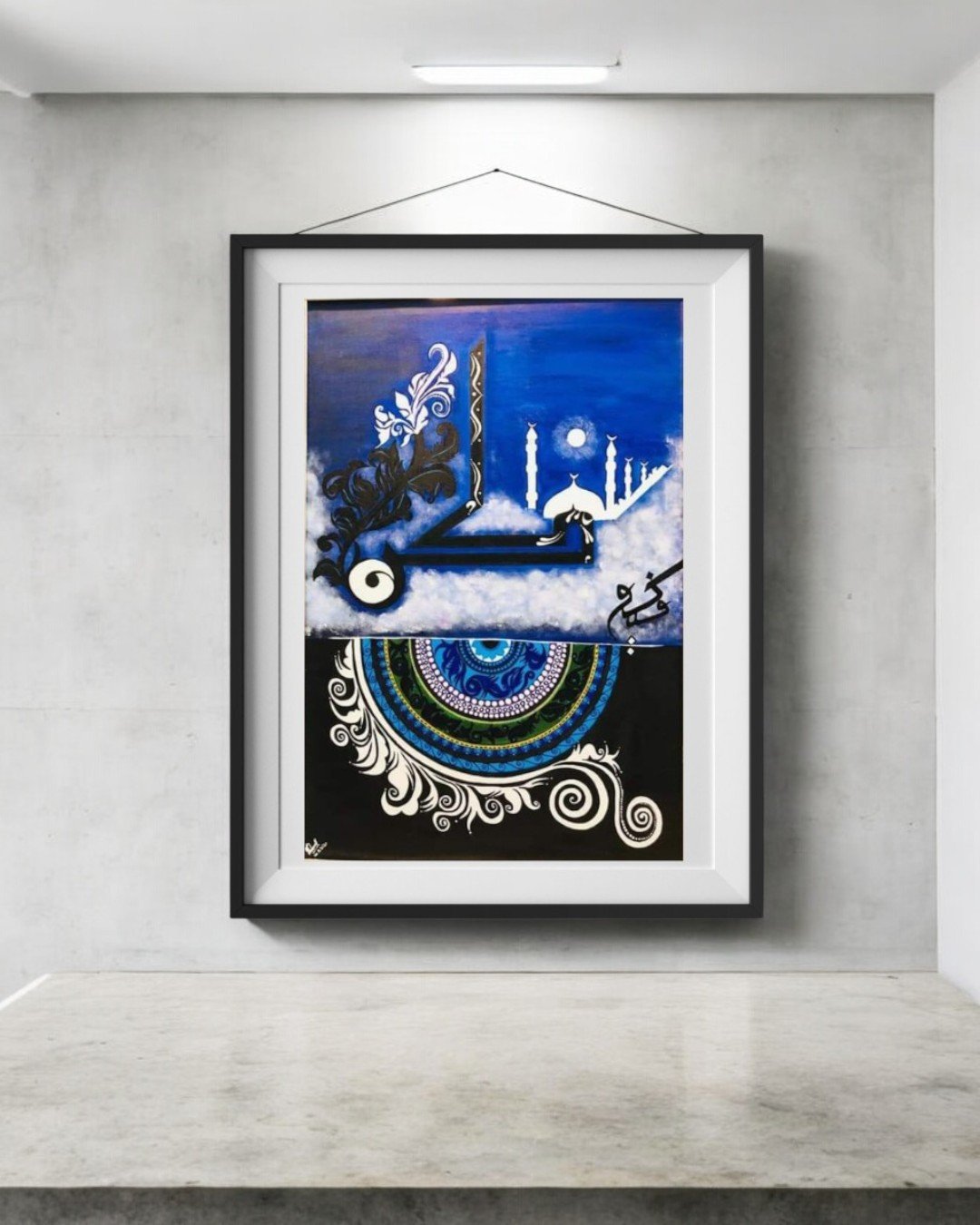 Immerse yourself in the spiritual essence of art with this stunning handmade painting. Featuring an elegant blend of Arabic calligraphy, intricate patterns, and deep celestial blues, this piece exudes a sense of peace and devotion. The detailed craftsmanship highlights the beauty of Islamic art, creating a harmonious balance between tradition and modernity. A perfect choice for enhancing the serenity of your living space, this artwork is a celebration of faith and creativity.