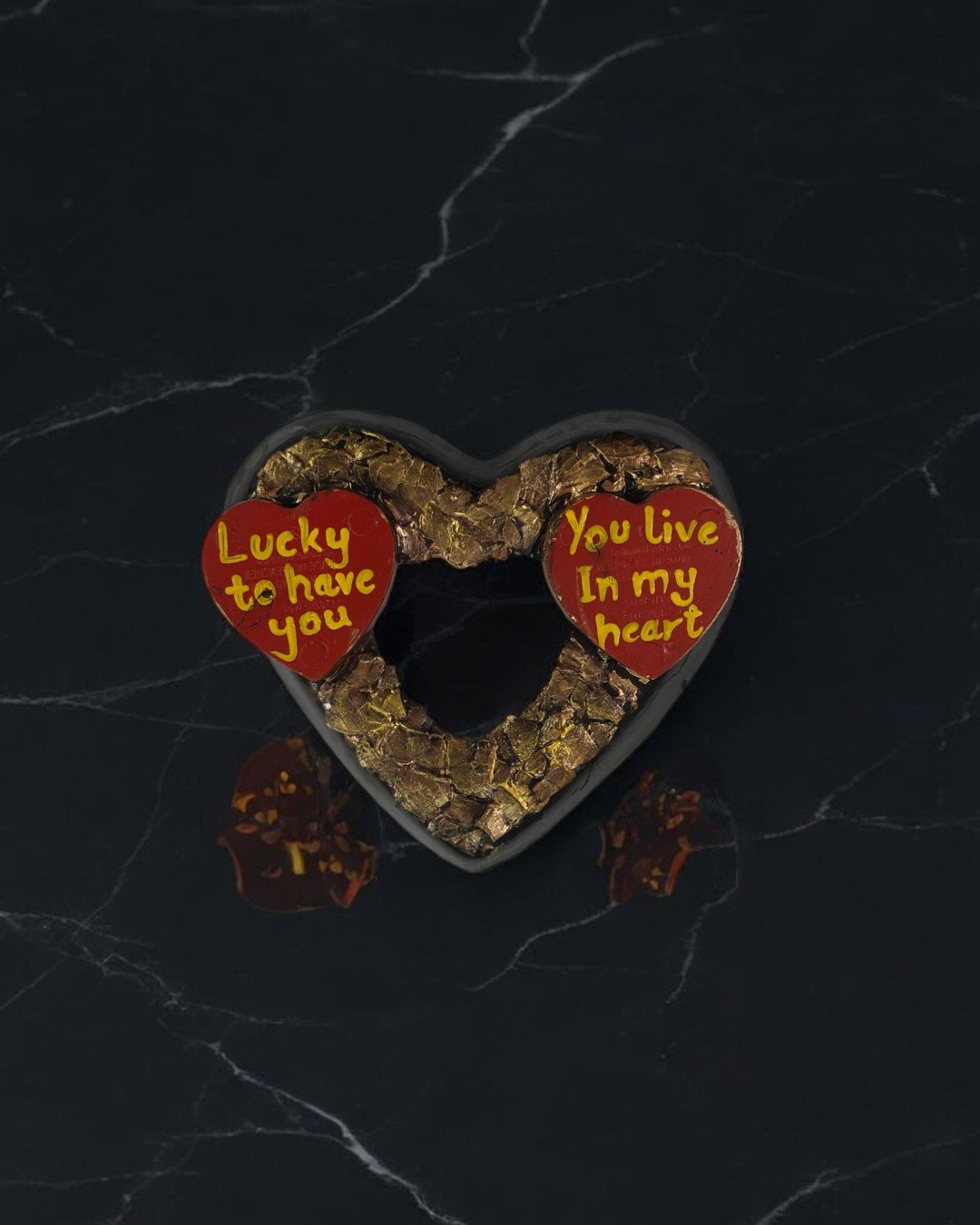 Showcase your love with this stunning handmade heart frame featuring textured golden accents and heartfelt messages, “Lucky to have you” and “You live in my heart.” Perfect for gifting or decorating, this piece is fully customizable in design and color. Slight variations in texture and lettering add a unique, personal touch to every frame.