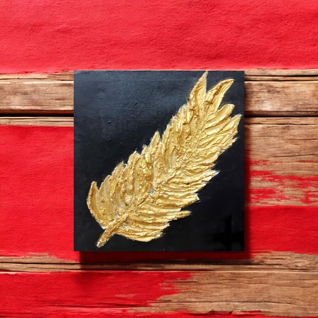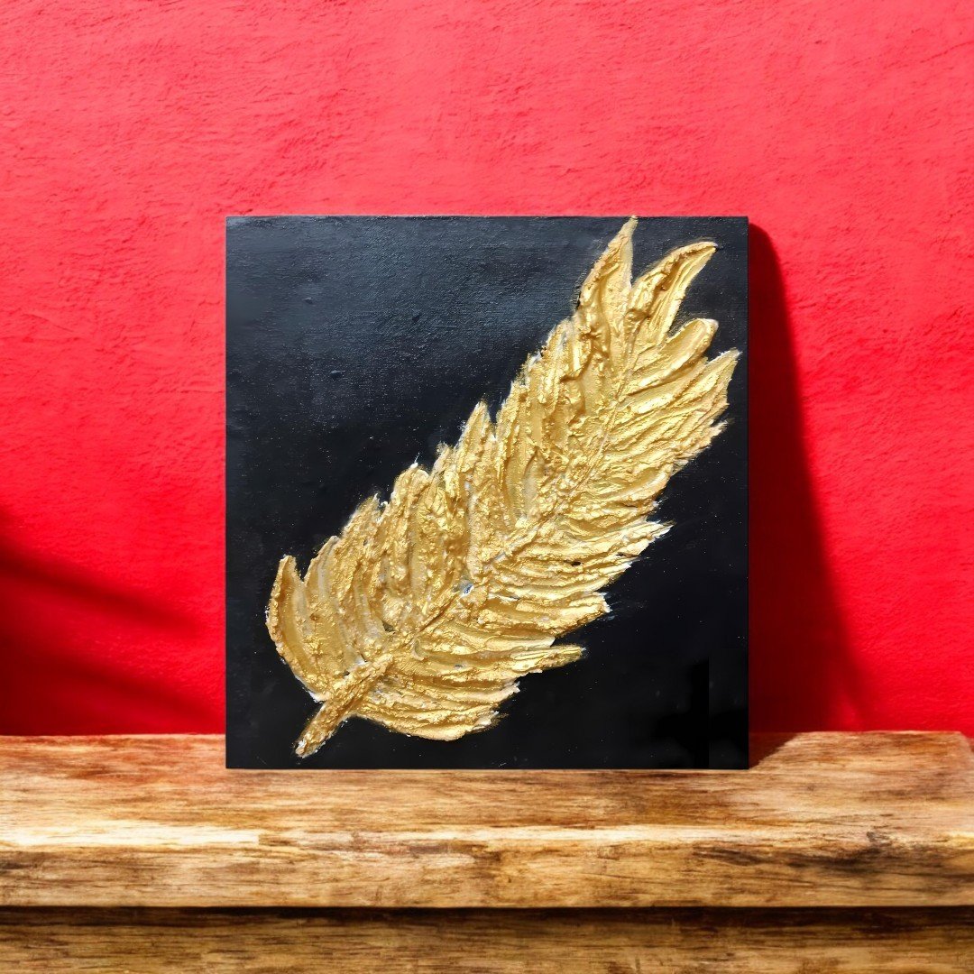 1 by 1 canvas.3d leaf made up of plaster of Paris right in the middle of the canvas.Black background with golden leaf added beauty of the simple yet deep 3d acrylic painting.