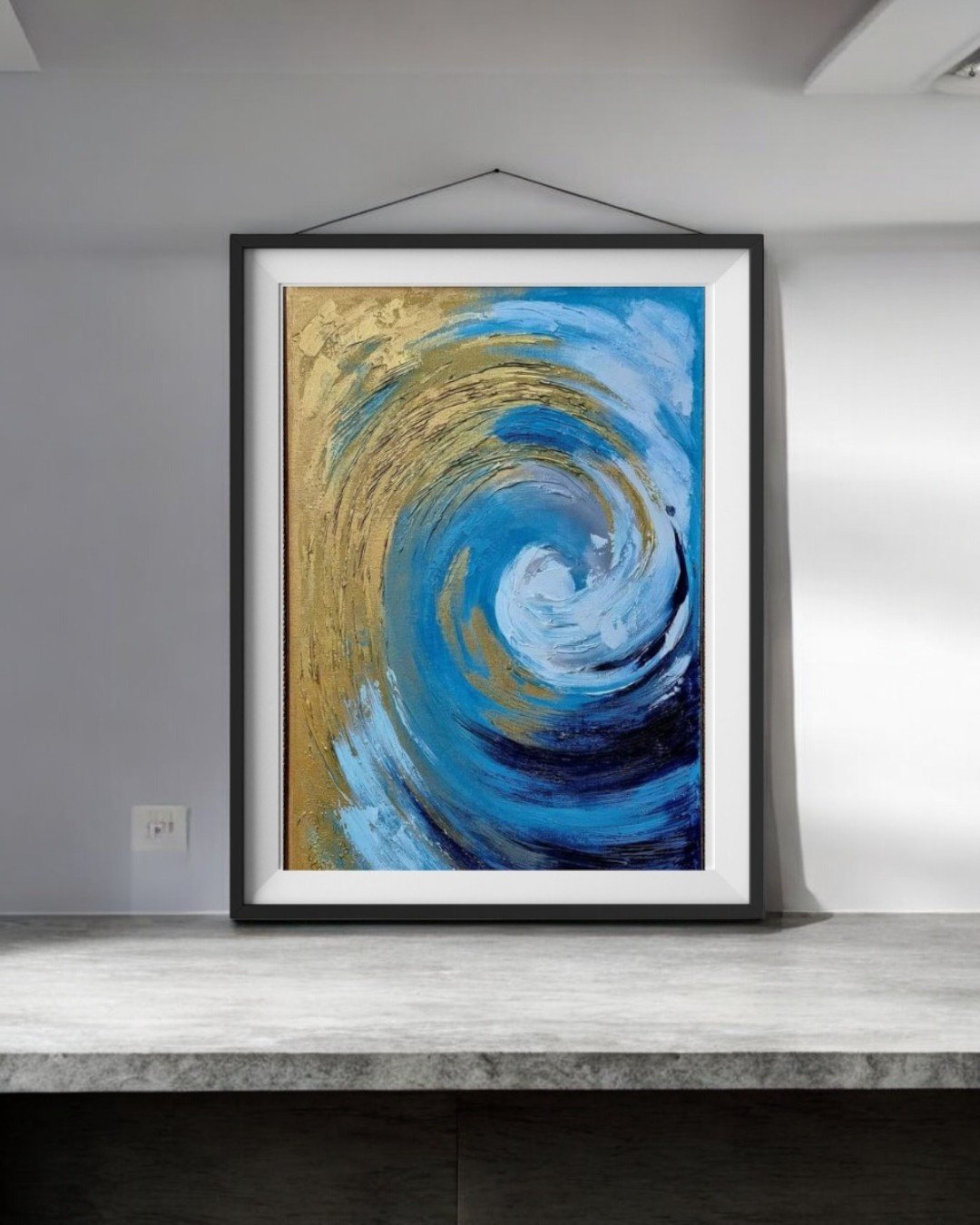 Dive into this handmade mesmerizing whirlpool of art with this abstract masterpiece. The rich hues of blue blend harmoniously with the golden accents, creating a dynamic contrast that symbolizes movement and tranquility. Perfectly framed, this painting adds a touch of elegance to any space, making it an ideal centerpiece for your living room or office. Its textured brushstrokes evoke depth, inviting viewers to lose themselves in its swirling depths.
