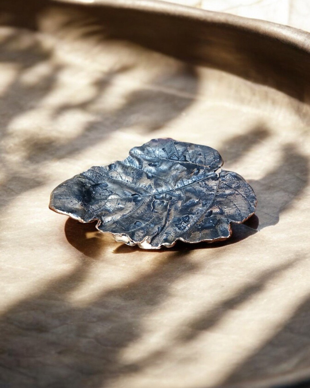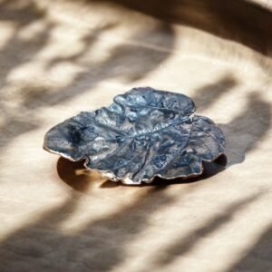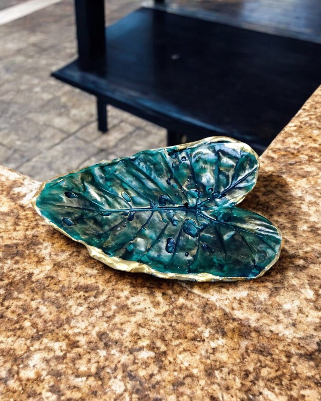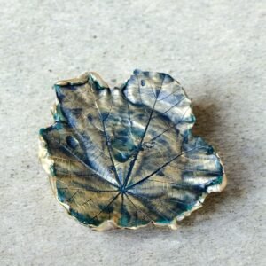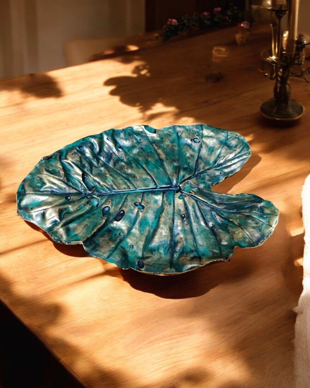 This beautiful handcrafted 6-8 inches leaf tray is made up of real leaf with black cement.This is one feet long beautiful article that can give an exuberant look if placed on center table or corner table.Metallic golden on ivy green acrylic colours are used on it.