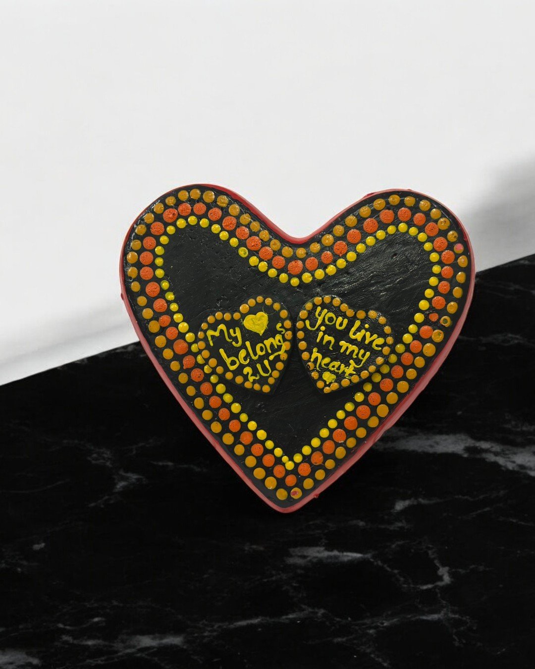 Express your affection with this vibrant handmade heart plaque featuring dot art and heartfelt messages. Perfect for special occasions or as a token of love, each piece is uniquely hand-painted with slight design variations, making it truly personal.