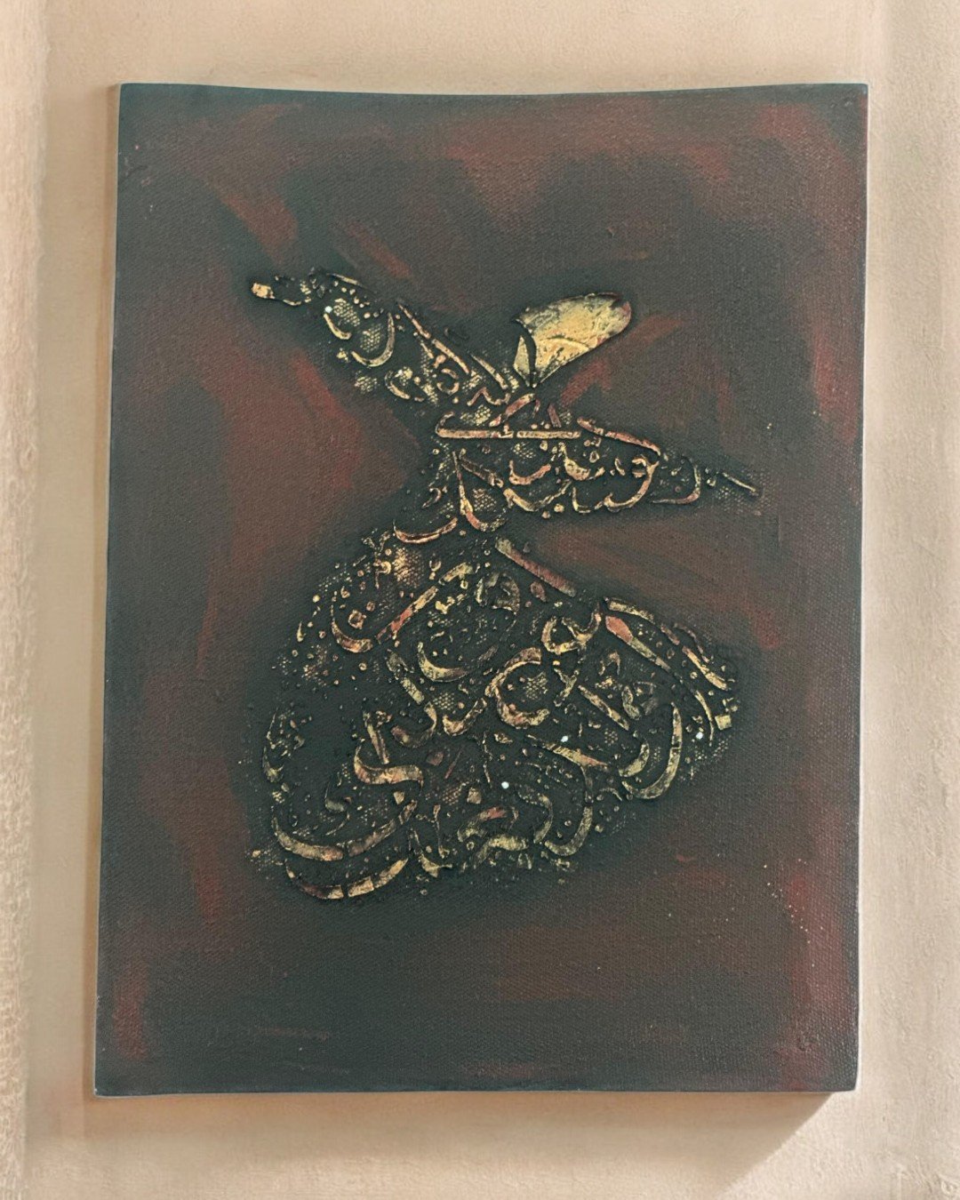 This handmade painting showcases a golden ornamental motif set against a rich red background with subtle textural details. A timeless piece to enhance your décor, fully customizable in colors and design to suit your style.