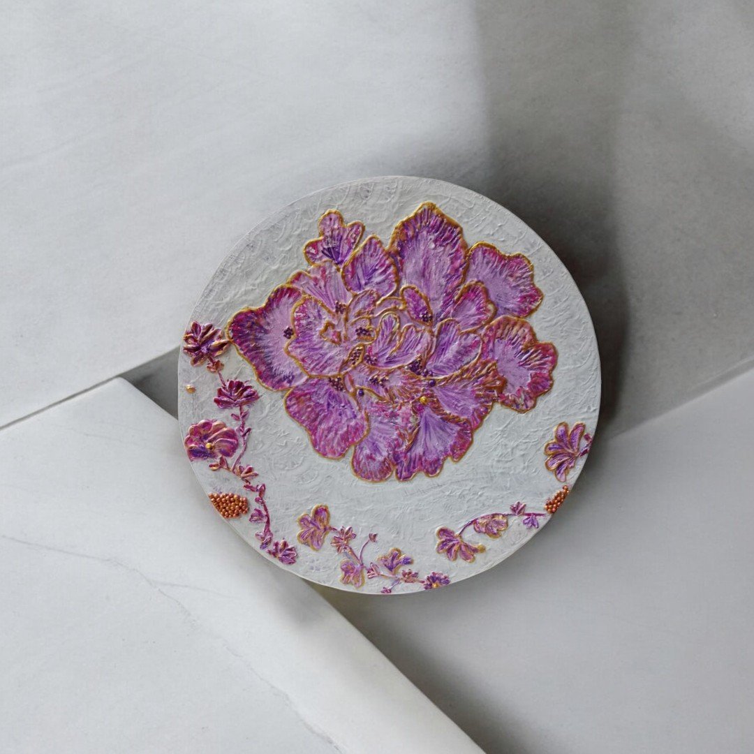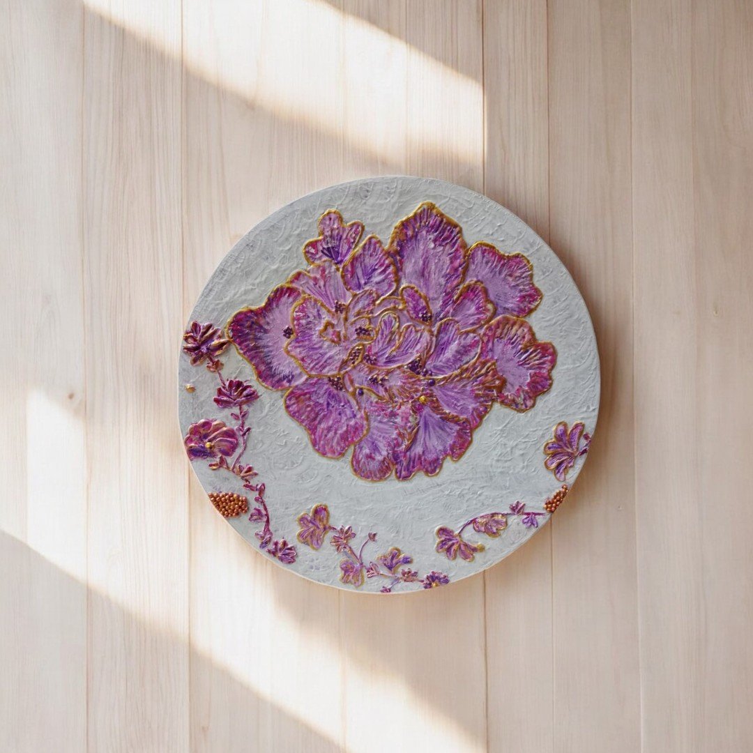 2.5 by 2.5 round canvas with 3D flower in the middle and a creeper consisting of small flowers and leaves with golden tiny balls spread here and there.Plaster of Paris is used to prepare surface along with 3d flowers.Pink, purple,red,white and golden acrylic colours are used.
