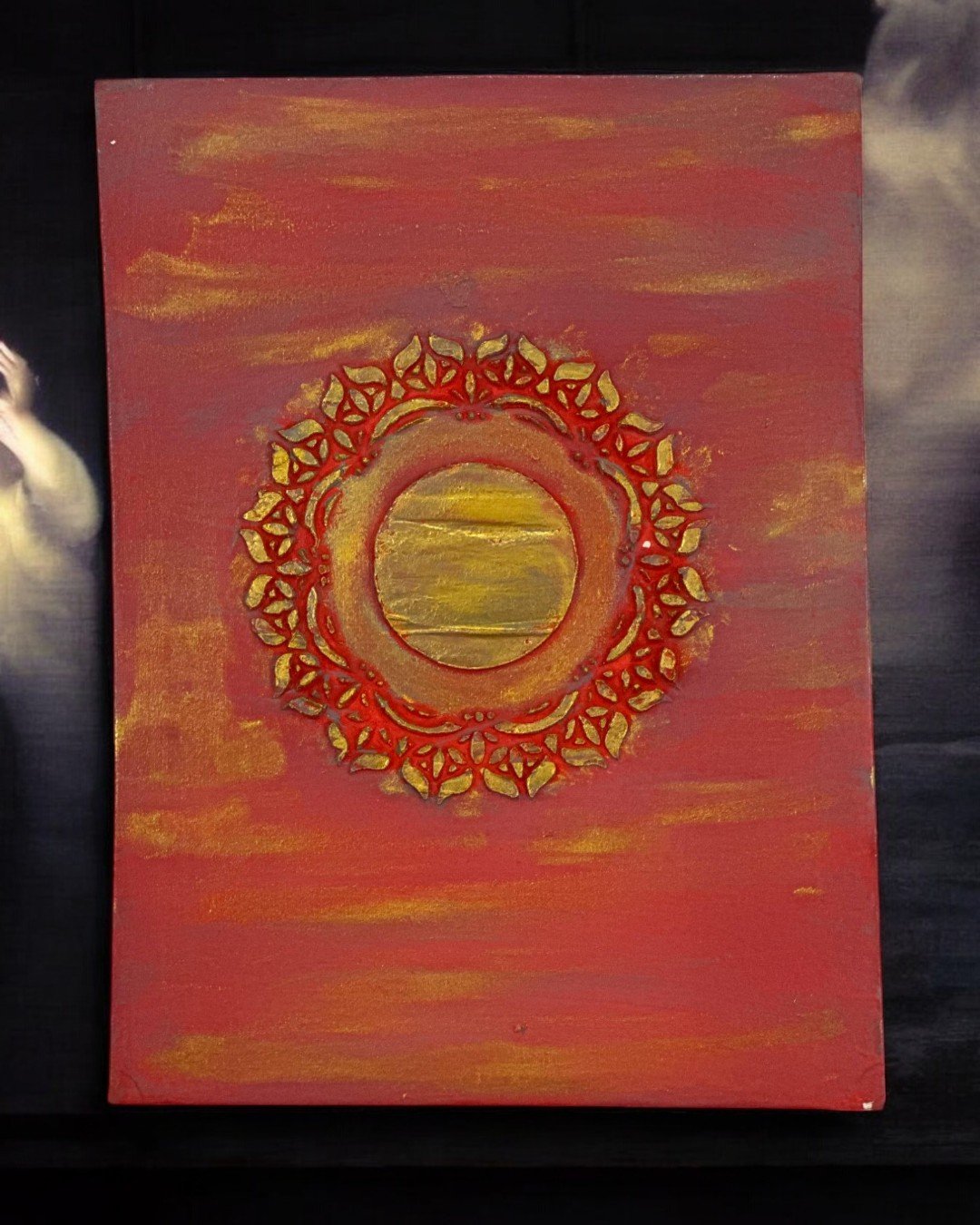 A stunning handmade artwork featuring a radiant golden sunburst design on a warm red canvas. This textured piece adds vibrancy and warmth to any room. Customizable in color and design to fit your preferences.