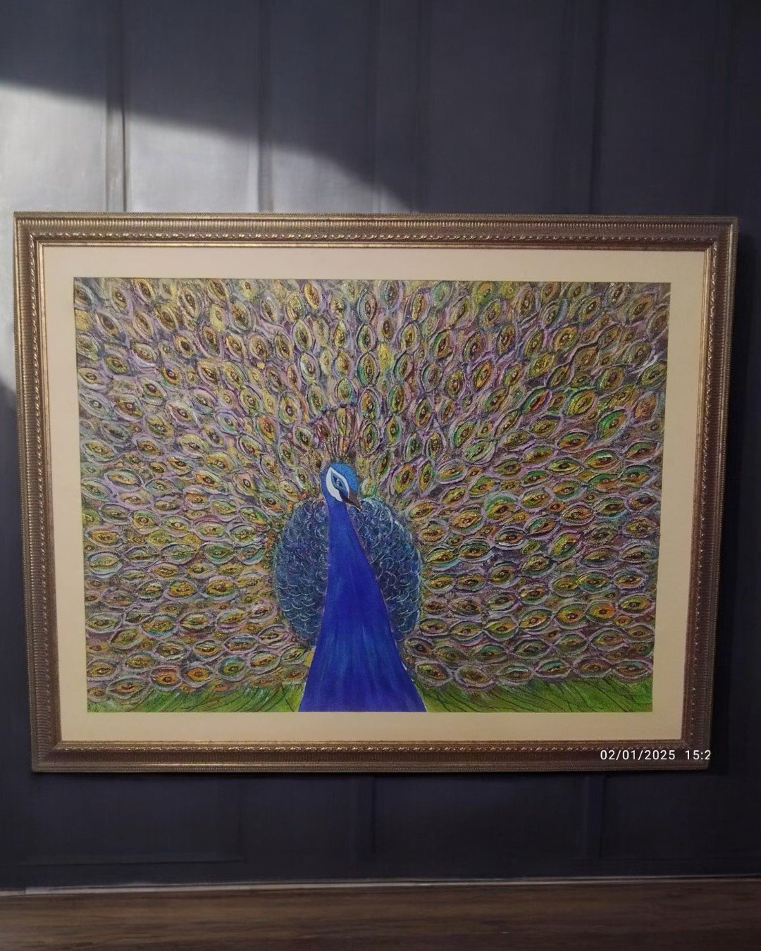 A stunning handmade painting of a majestic peacock, bursting with vibrant colors and intricate details (dimensions: 4.5/4.5). Perfect for adding elegance and charm to any space. Completely customizable in terms of colors and design to suit your preferences.