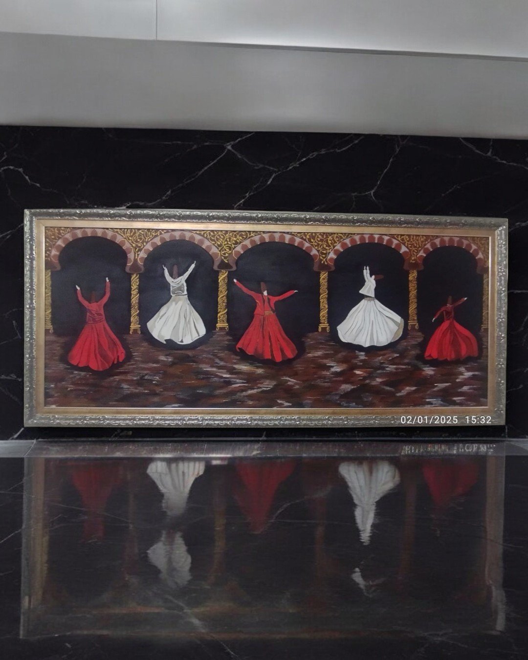 A mesmerizing handmade painting featuring a group of whirling dervishes in vibrant red and white, set against an intricate architectural backdrop (dimensions: 2/5). This artwork radiates spirituality and grace. Fully customizable to match your color and design preferences.